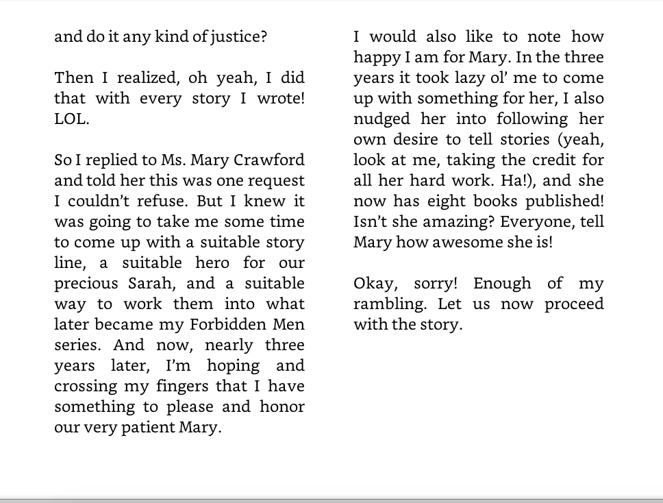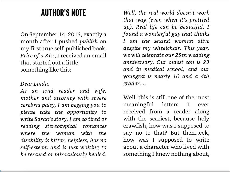It’s amazing to think that one letter could change in my life so significantly. Linda, I want to thank you for honoring my request and writing Priceless (The Forbidden Men Book 8) and making Sarah so absolutely unique and the perfect partner without minimizing her disability.